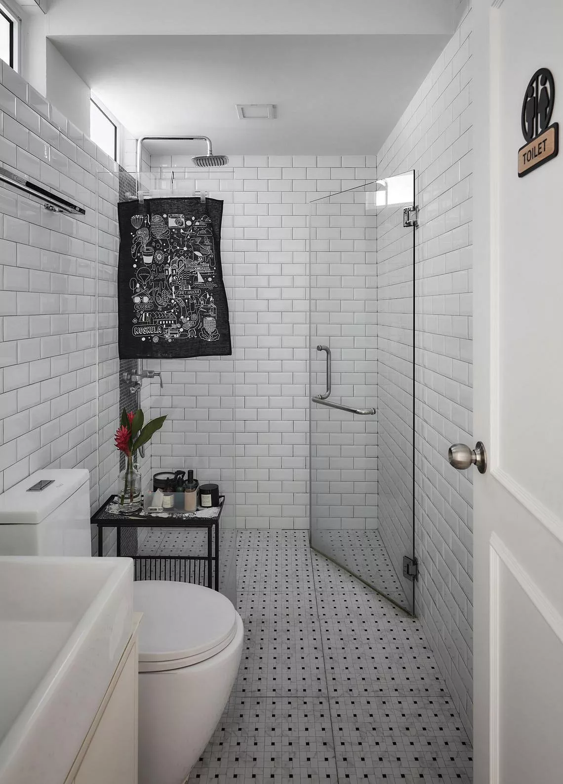 El baño está diseñado al estilo de Nueva York, con azulejos blancos tipo metro en las paredes y mosaicos de suelo en blanco y negro. La pareja no contrató a un diseñador de interiores, ya que la unidad ya había sido renovada.