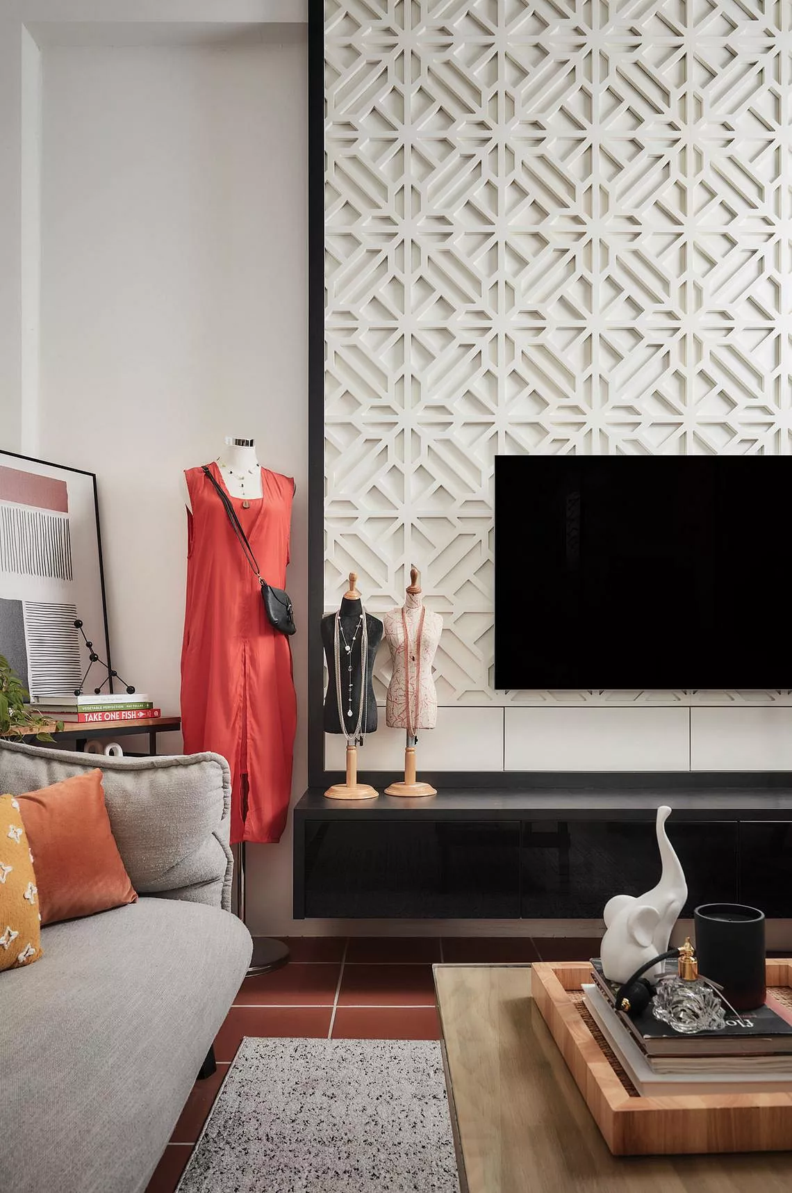La pared decorativa en la sala de estar recuerda a las rejillas de aire de concreto que se encuentran en muchas estructuras antiguas de Singapur. “Tuvimos que ser imaginativos para ver cómo encajaban las piezas en el entorno”, dice Leong. A lo largo del camino, cometieron errores y vendieron algunas piezas, reemplazándolas por otras más adecuadas.