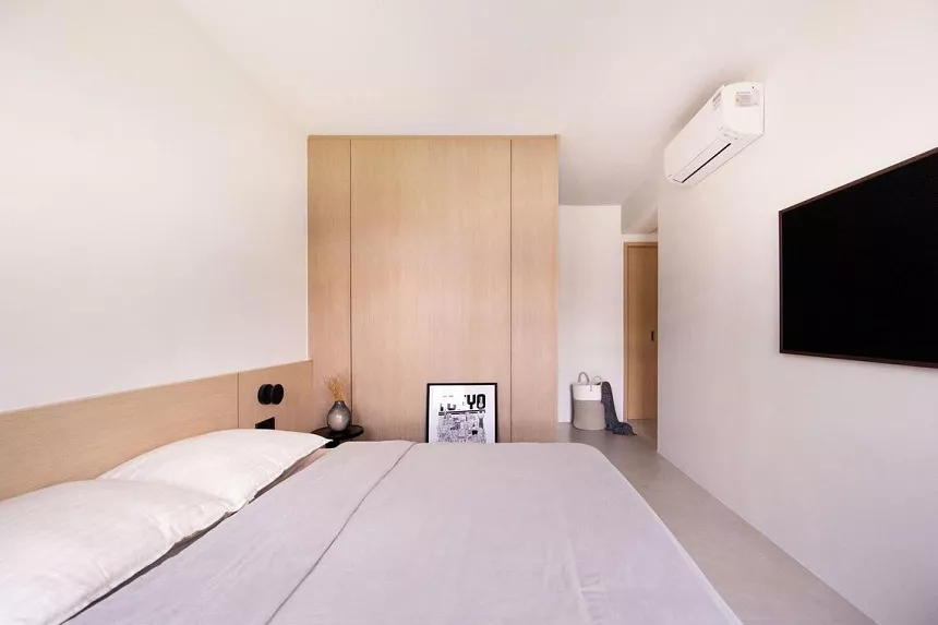 La cama, vestida con ropa de cama neutra, está posicionada contra un fondo de madera clara. FOTO: DISTINCTIDENTITY El dormitorio cuenta con un armario hecho a medida que se mezcla perfectamente con la pared.