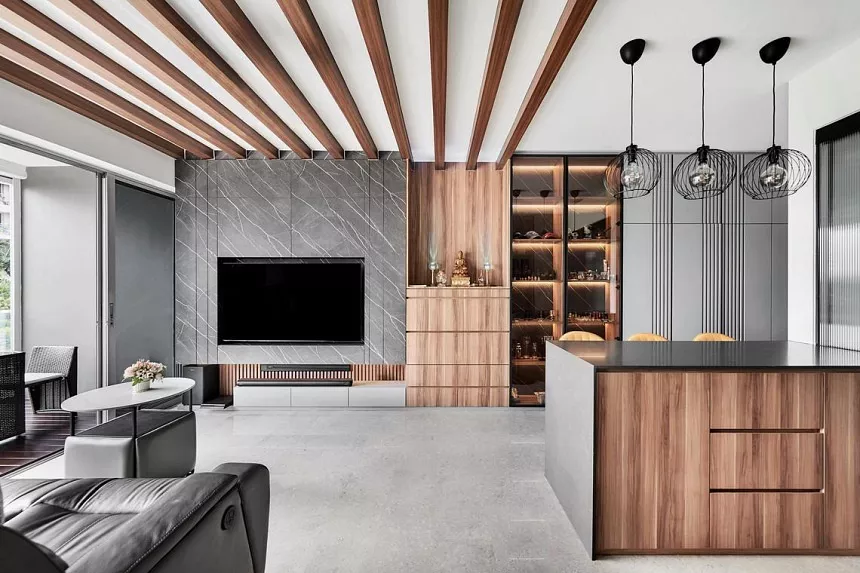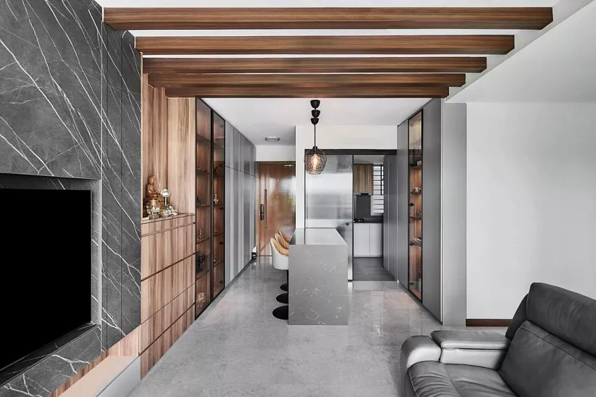 La madera contrasta con la paleta blanca y gris, elevando el diseño del apartamento. FOTO: WA DEXIGN Uno de los mayores desafíos fue asegurar que la pared principal complementara el altar y el mueble de exhibición adyacente. En lugar de buscar una coincidencia idéntica, la Sra. Bak introdujo la madera en el altar y los estantes de exhibición, enriqueciendo el esquema de diseño con otra dimensión.