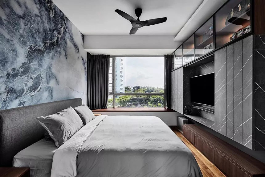 Un papel tapiz con impresión de mármol en la pared detrás de la cama establece un diálogo interesante con la pared principal del televisor. FOTO: WA DEXIGN La pareja optó por un lenguaje de diseño similar para la pared principal del televisor en el dormitorio principal, combinando laminados en gris, aspecto de mármol y madera con gabinetes de vidrio arriba.