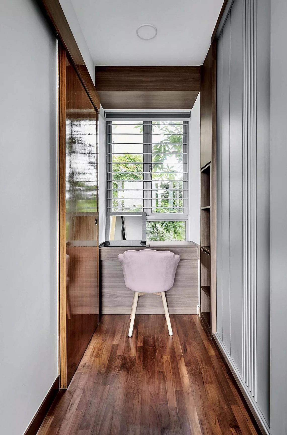 Una pequeña mesa de tocador ha sido incorporada en el vestidor. FOTO: WA DEXIGN El vestidor refleja un diseño estriado similar y laminado gris como los armarios empotrados a lo largo del vestíbulo de entrada para establecer una sensación de continuidad. Una pequeña mesa de tocador aprovecha el espacio bien iluminado debajo de una ventana en el vestidor, con una tapa de tocador abatible y espacio debajo para guardar el maquillaje de la propietaria.