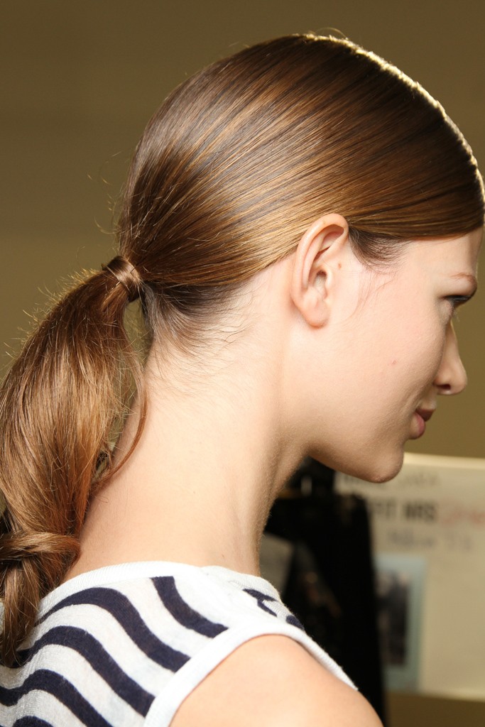 El pelo fue igual de sencillo, pero aún así, tremendamente favorecedor y con clase: raya a un lado y recogido en una coleta baja (el peinado del invierno parece que reinará en el verano también). Ésta se rizaba en el extremo, quedando así un sutil, pero encantador tirabuzón. La goma se queda oculta por el propio cabello de la modelo, con un mechón enroscado al rededor de ella.