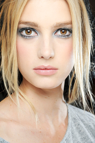 Las sombras del ojo van en tonos azules y grisáceos, con un acabado metálico para lograr ese efecto moderno-futurista que se andaba buscando. Los tonos que se emplearon fueron Chanel Ombre Essentielle Soft-Touch Eyeshadow en Furtif, que Phillips aplicó en el párpado superior de forma ascendente.