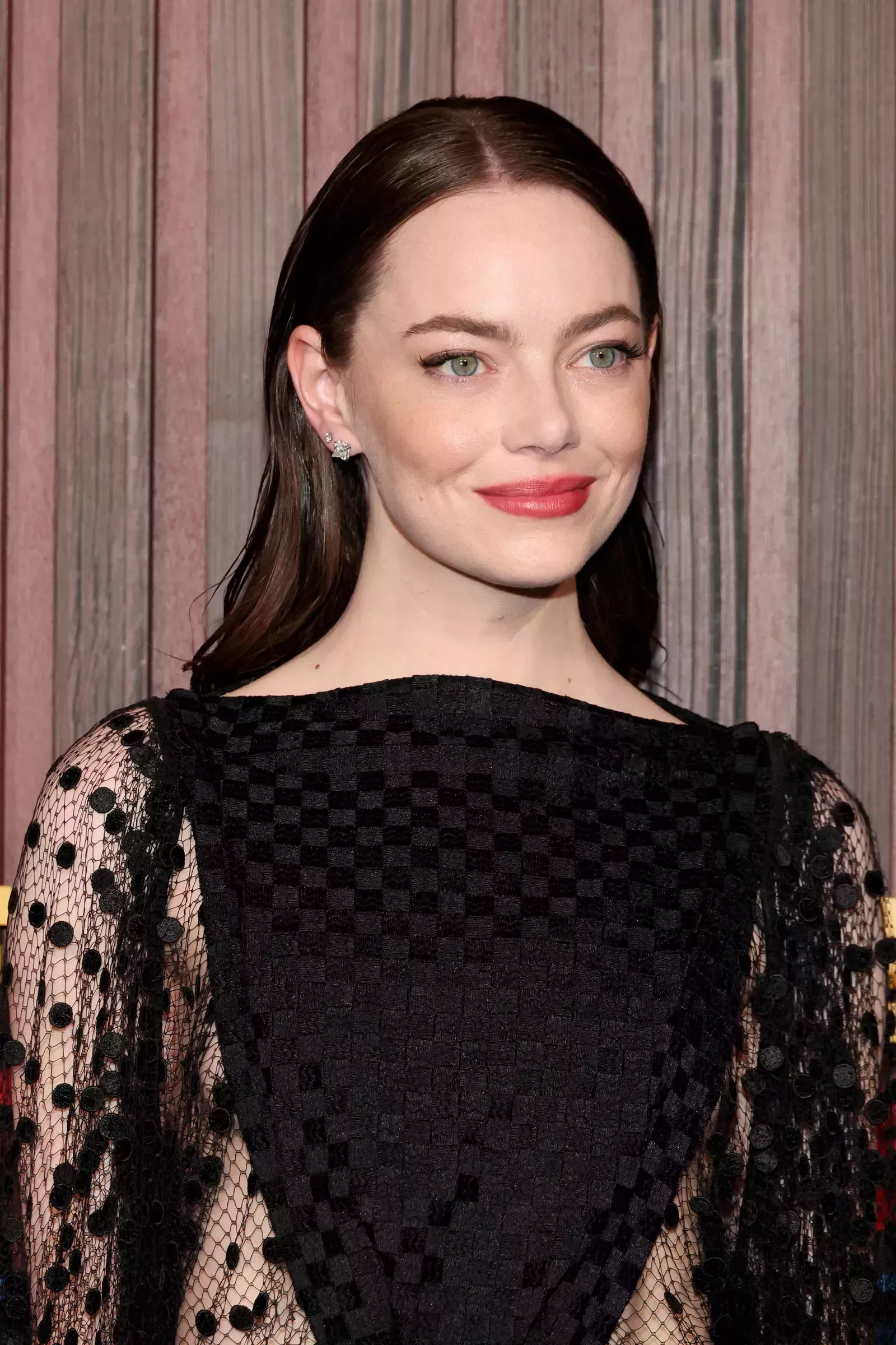 Aunque el pelo de Stone sigue teniendo un ligero brillo rojizo, ahora es más moreno que pelirrojo. El color es una combinación de moreno espresso con un matiz rojo, que resalta los ojos verde claro de Stone. La colorista y peluquera de Stone , Mara Roszak, calificó su look de "diosa vampiresa", lo que sin duda encaja con el pelo oscuro y el vestido negro con lunares transparentes y paneles de red. Roszak peinó a Stone con sencillez, pasándoselo por detrás de las orejas y añadiendo un poco de producto para darle un aspecto húmedo. En cuanto al maquillaje, Stone mantuvo la misma sencillez con un bonito colorete melocotón y labios rosas.