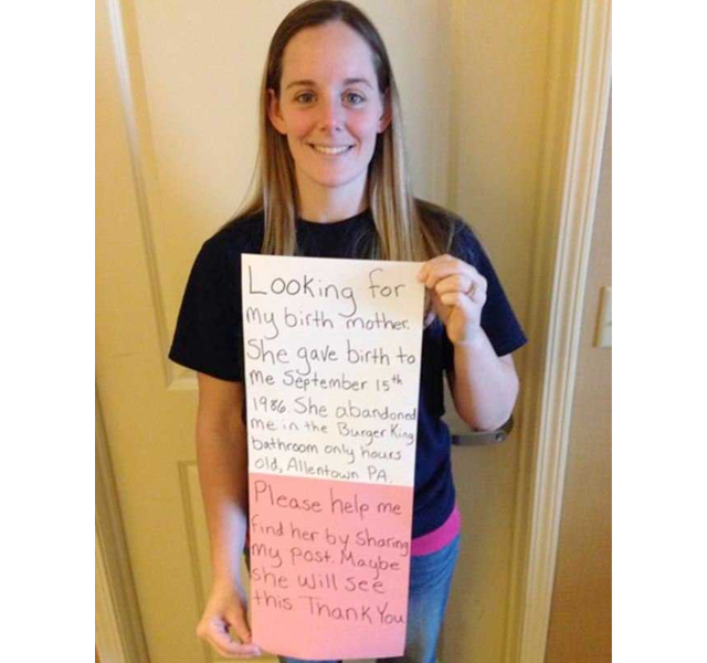 La joven deseaba por encima de todas las cosas encontrar a su madre biológica e, imaginamos, pedirle explicaciones de por qué la abandonó en una hamburguesería y no la dio en adopción nada más nacer. Pues bien, ella no encontró otro modo que colgar una foto suya con un cartel en el que se leía: "Estoy buscando a mi madre biológica. Ella dio a luz el 15 de agosto de 1986. Me abandonó en el baño de un Burger King con sólo unas horas en Allentown PA. Por favor ayudadme a encontrarla compartiendo este post, así quizás ella lo vea. Muchas gracias". La cosa es que la idea obtuvo sus frutos y finalmente Katheryn pueda tener su esperado reencuentro con su madre.