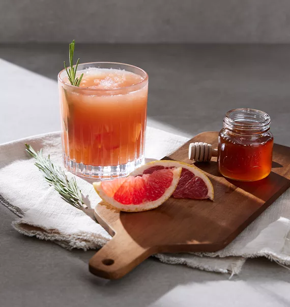 - Agrega hielo, luego llena el resto del vaso con agua carbonatada. Decora con una ramita de romero. Para mayor dulzura, puedes añadir un poco de miel.