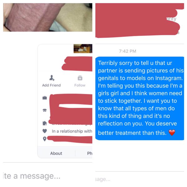 “Siento decirte que tu pareja está mandando fotos de sus genitales a modelos por Instagram. Te digo esto porque soy una chica de chicas y pienso que las mujeres necesitamos estar unidas. Quiero que sepas que todo tipo de hombres hace esto y que no tiene que ver contigo. Te mereces un mejor trato que esto”.