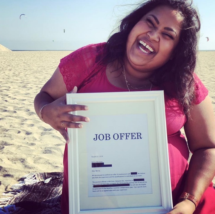 Esta mujer estaba cansada de ver como solo las personas que se casan o que tienen hijos son las que se muestra felices. A sus 37 años, Benita Abraham tiene su Facebook repleto de fotos de bodas, de embarazos y de bebés recién nacidos. Por eso ella, que no necesita ninguna de estas cosas para ser feliz, decidió mostrar su felicidad por estar en uno de los mejores momentos de su vida. Benita estrena nuevo trabajo y está encantada con ello.