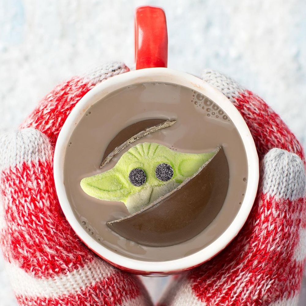 - El bebé Yoda se ha apoderado de productos desde libros para colorear hasta adornos navideños, y ahora viene por su chocolate caliente.
