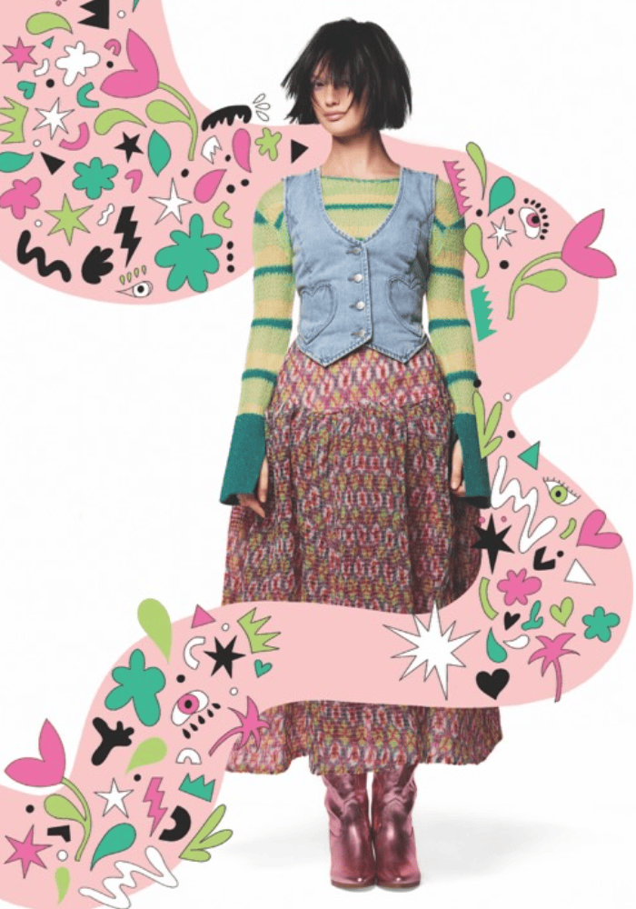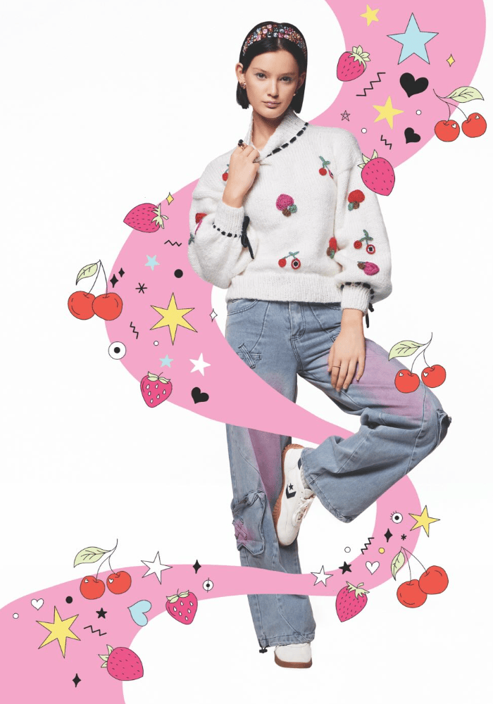 Pinta la ciudad… de rosa. No hay mejor manera de dejar tu huella que con unos vaqueros de lavado rosa y un suéter adornado con bayas.