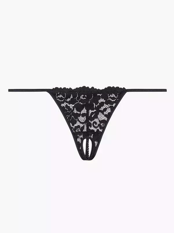 Sí, existe una braguita sin entrepierna de alta costura. Este tanga lo tiene todo: detalles sexys de tiras, unos coquetos bordados florales y un ingenioso diseño que casi parece una flecha que apunta a la *gran apertura*. Si te gusta, seguro que quieres ver el conjunto de liguero para completar el look.