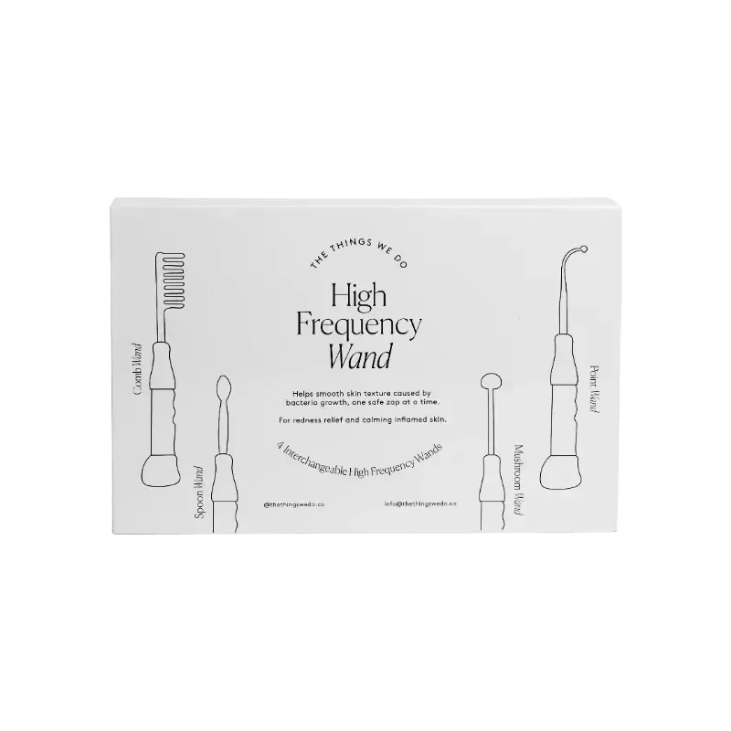 Las varitas de argón violeta eliminan las bacterias y reducen los brotes, además de calmar la inflamación y el enrojecimiento. La varita de puntos se dirige a los brotes individuales, y la varita de cuchara trata afecciones más generales de la piel, como rojeces e hinchazón.
