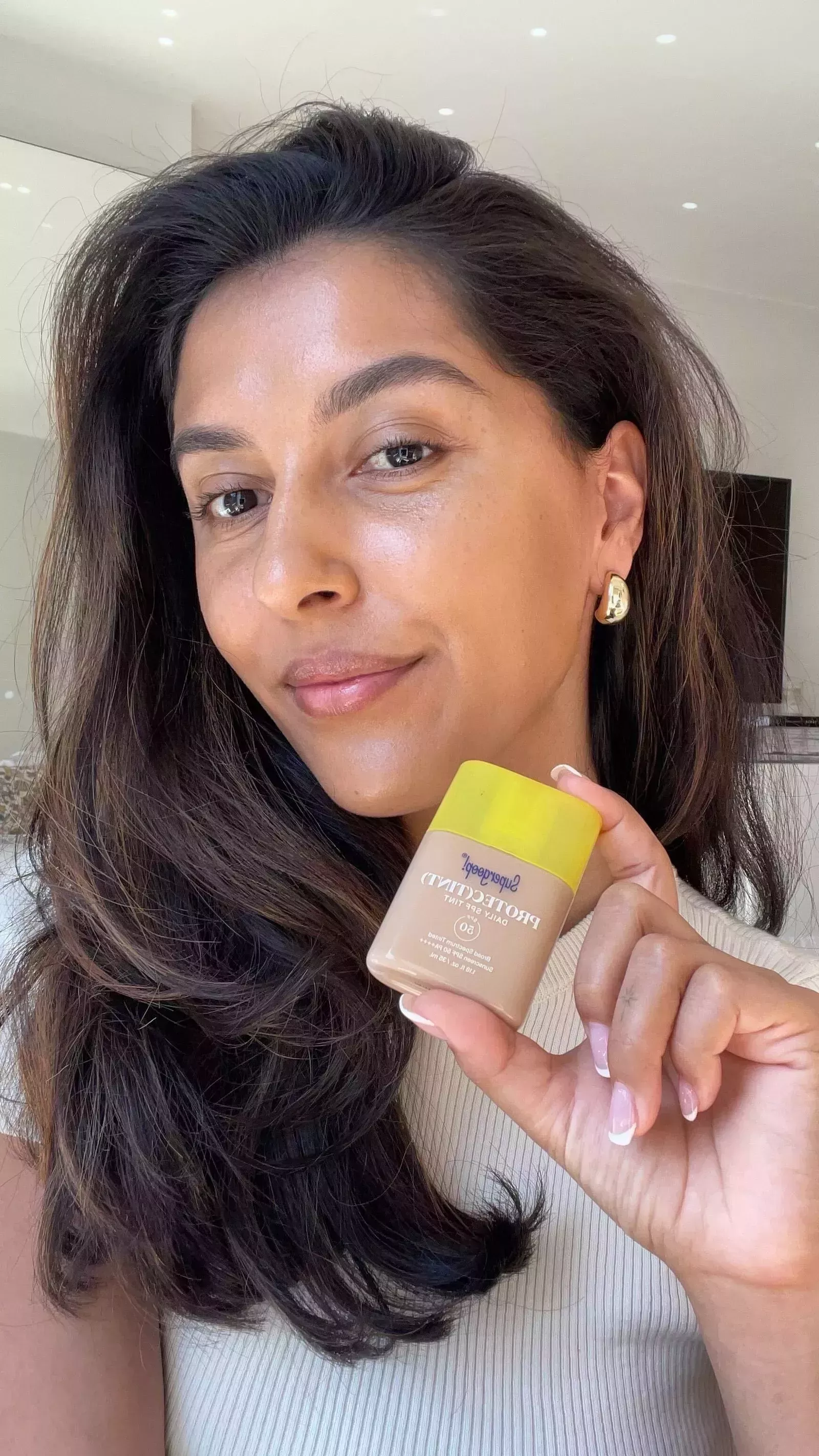 Hoy en día, no puedo salir de casa sin echarme grandes cantidades de protector solar facial, especialmente el Supergoop Protec(tint) SPF Tint. Este producto para el cutis con SPF está disponible en 14 tonos, y me encanta que funcione más como una base de maquillaje de cobertura media que como un tinte (como su nombre indica).