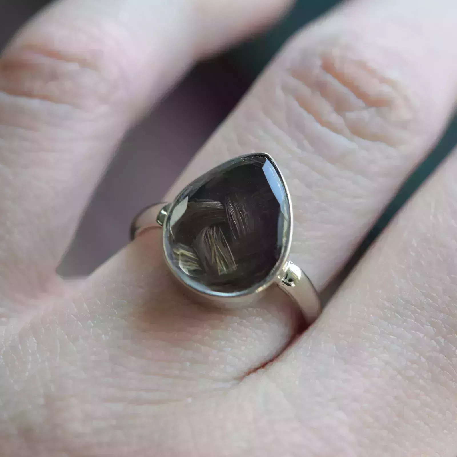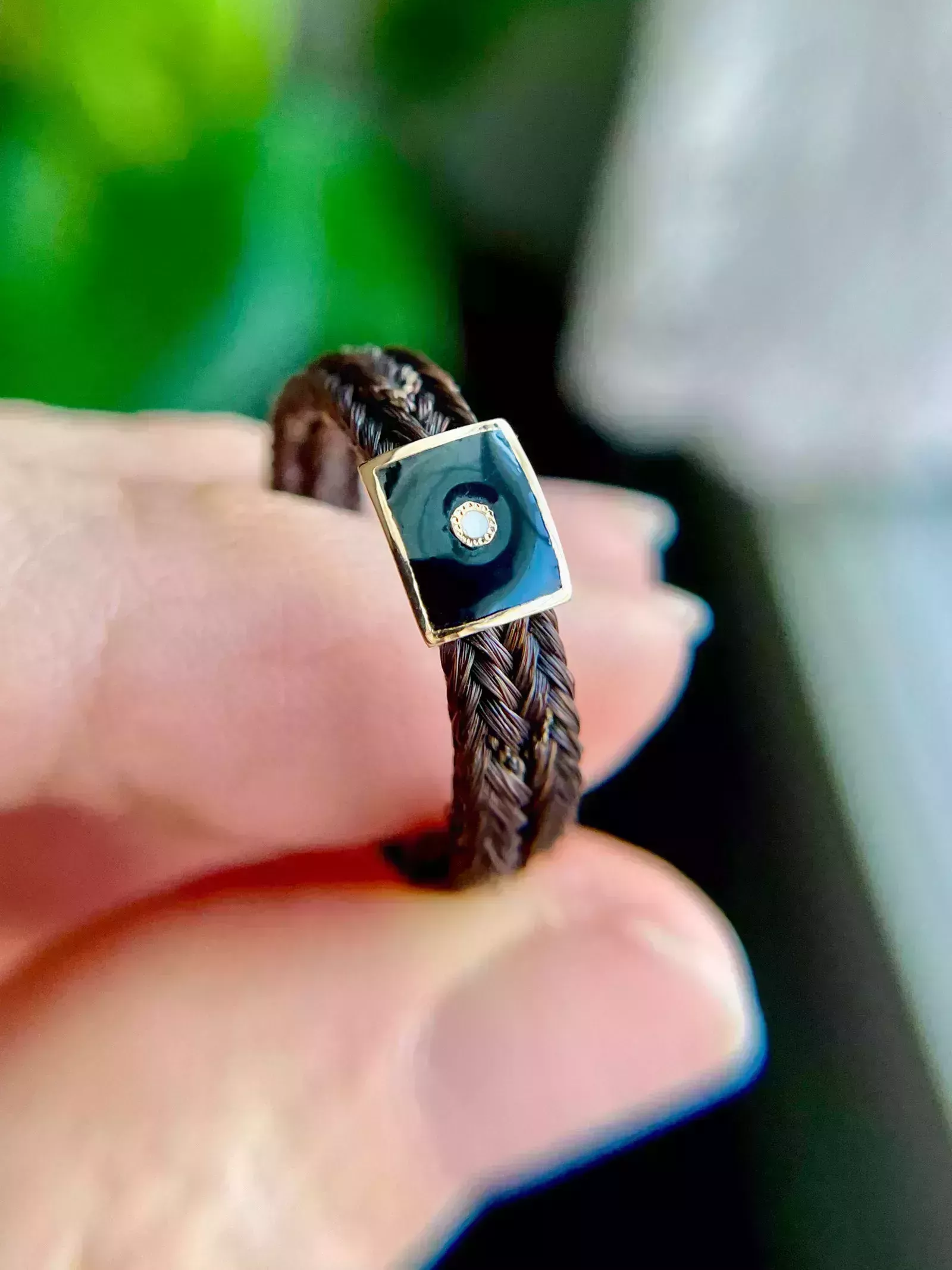 Las opciones para hacer arte con cabello humano son enormes, incluso si no se tiene la previsión de guardar una coleta entera. Lane convirtió un mechón de dos centímetros y medio de la abuela fallecida de una clienta en "la flor de pelo más pequeña que he hecho hasta la fecha". Últimamente Lane ha visto un repunte en las peticiones de coronas hechas con pelo de toda una familia, lo que le permite entrelazar diferentes colores y texturas de cabello en una gran pieza, como se ve en las fotos de arriba. Las piezas favoritas de Hansen son los anillos, sobre todo cuando se tejen con el pelo de varias personas, como este conjunto que hizo recientemente para una madre y su hija.