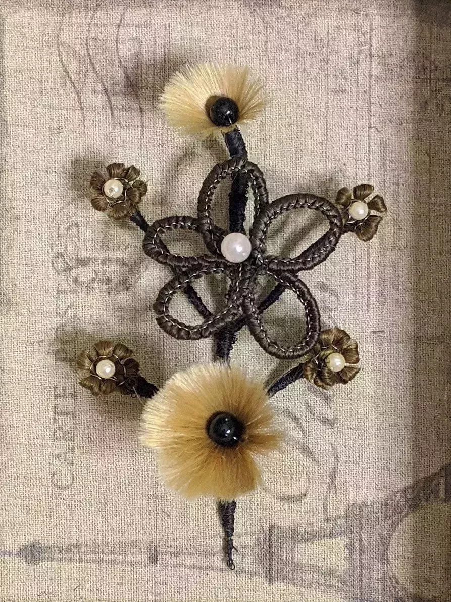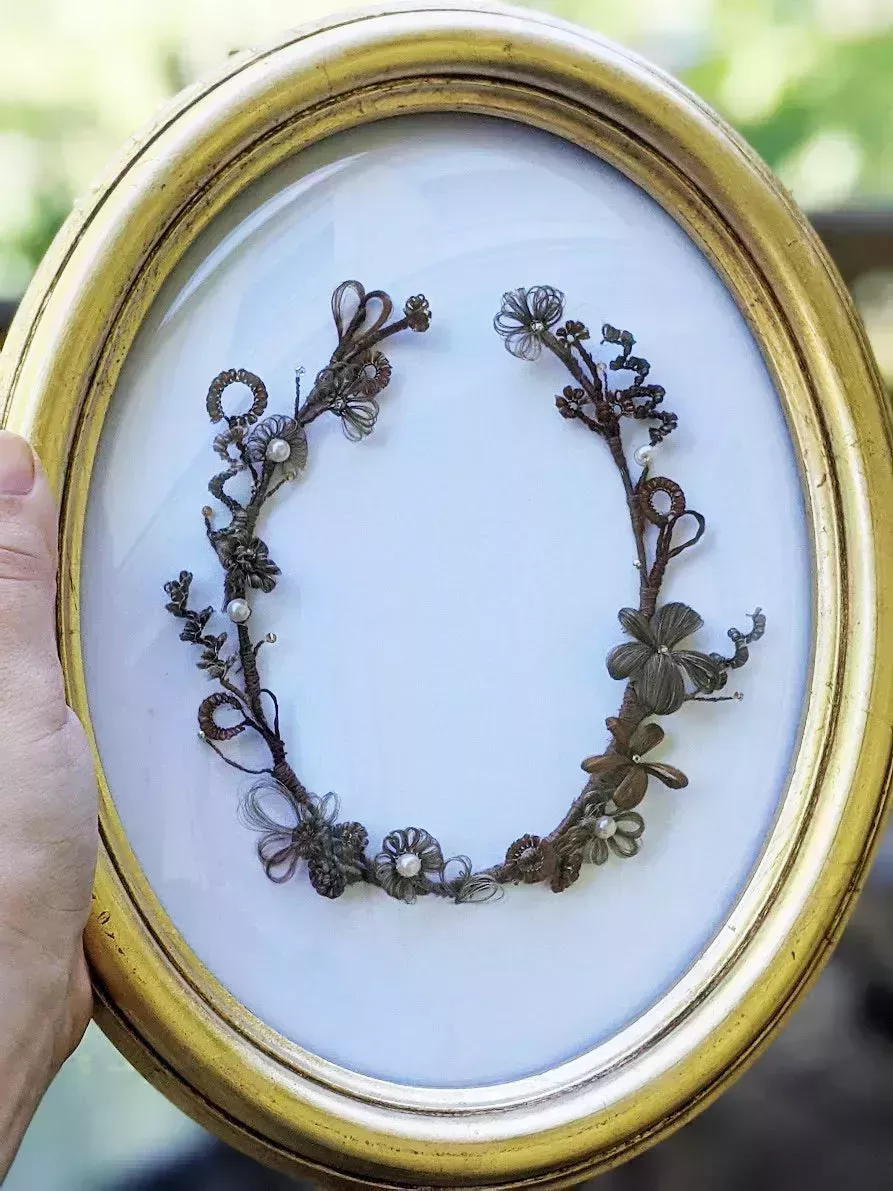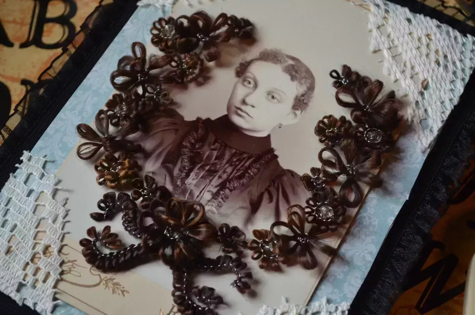 (Nota: soy escéptico sobre la capacidad de mis antepasados blancos europeos para inventar esta práctica de la nada. Los historiadores con los que hablé para este artículo coinciden en que es probable que las culturas de todo el mundo hayan practicado algún tipo de trabajo del cabello desde siempre, pero los registros anteriores al siglo XIX son escasos. "El pelo es un material muy orgánico", afirma Hansen, refiriéndose a su tendencia a desintegrarse por completo. "Creo que hemos perdido mucha información sobre cómo se utilizaba". Las pruebas que tenemos de América del Sur, Asia y África parecen ser de artículos funcionales, como redes, cestas o ropa de cama, cosas sobre las que no se habría escrito ni tratado de conservar como se haría con una joya especial).
