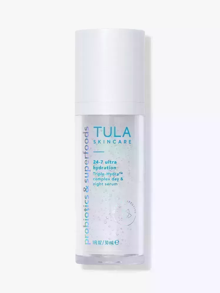 Cuando el sérum llama, el sérum de día y noche 24-7 Ultra Hydration Triple-Hydra Complex de Tula responde. En su sedosa fórmula, encontrarás tres pesos moleculares de ácido hialurónico y ácido poliglutámico superhidratante, un humectante que se encuentra comúnmente en la soja fermentada.