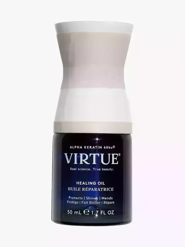 Por qué nos encanta: Cuando oyes el nombre "Aceite Curativo", puedes esperar reparación de daños, fortalecimiento y brillo resplandeciente, y este cumple en todos los frentes. Virtue Healing Oil tiene una proteína de queratina patentada que es idéntica a la queratina que se encuentra de forma natural en nuestro cuerpo, por lo que la reconoce como propia. Esto significa que sabe exactamente cómo reparar y transformar el cabello seco y quebradizo. "Es un producto que recomiendo a mis clientas con cabello fino que sufren roturas por las mechas o si su cabello es débil y tiene el potencial de romperse en una longitud determinada", dice Nast. Y con aceites nutritivos como el de marula y el de semillas de sandía, no sólo repara, sino que hidrata, suaviza y deja el cabello con un brillo increíble y saludable".