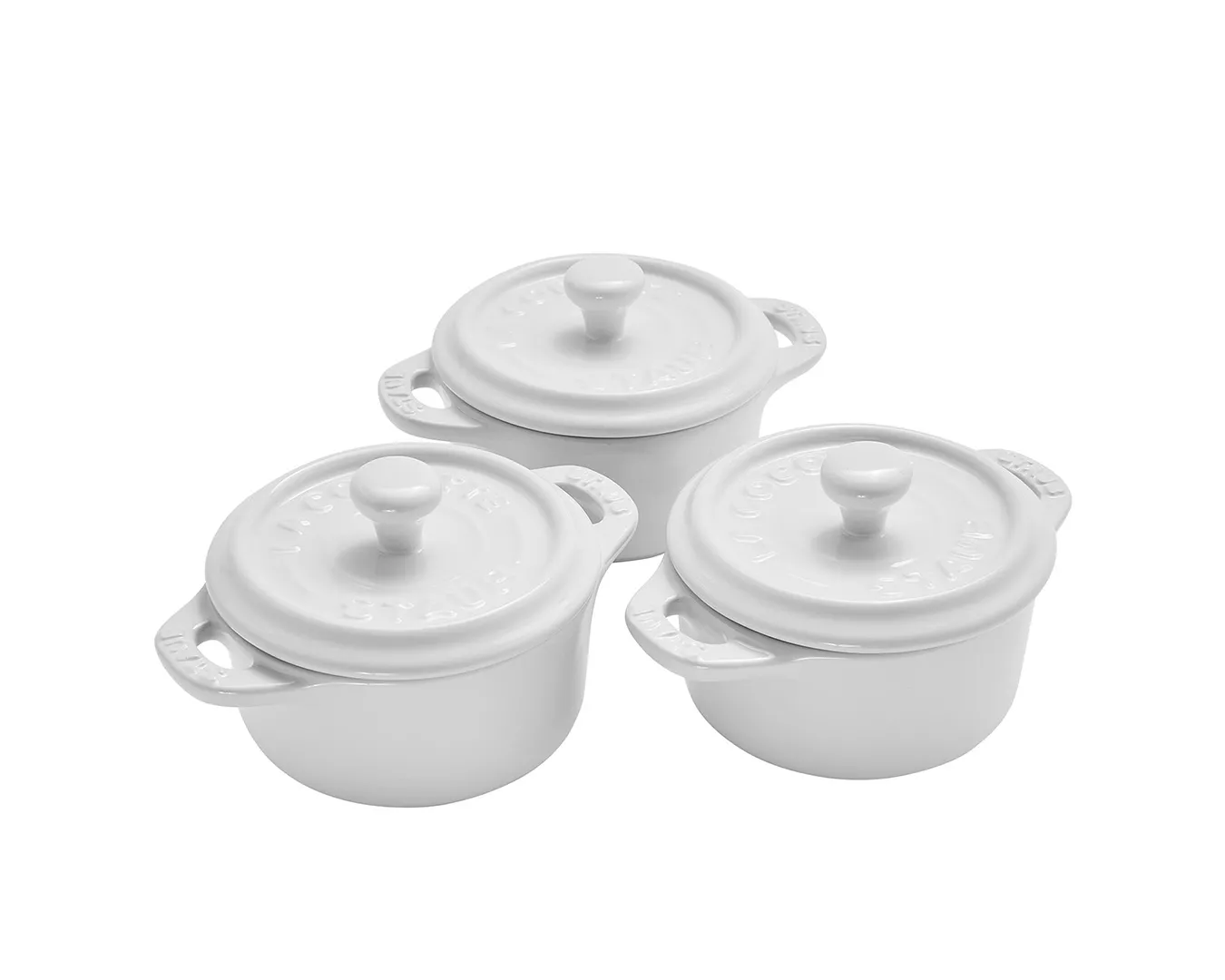 Los regalos prácticos no tienen que ser aburridos. Este elegante trío de cocottes va del congelador al horno (¡o microondas!) a la mesa, y son tan versátiles. Úsalos para hornear postres individuales, almacenar sal y pimienta en el mostrador o como platos de servicio para bocadillos… tantas posibilidades.