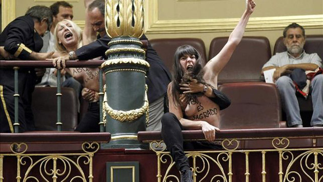 Feministas del grupo Femen, que hace unos días se manifestaban en la semana de la moda de París, han irrumpido esta mañana en el Congreso de los Diputados a grito de "el aborto es sagrado".