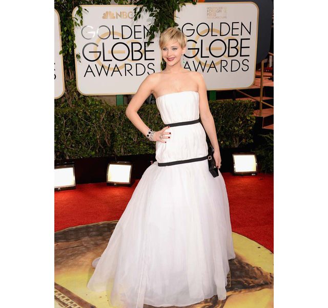 Con todo el dolor de nuestro corazón incluímos en nuestra lista de las peor vestidas de los Globos de Oro del 2014 a Jennifer Lawrence, quien volvió a apostar por Dior pero en un modelo que muchos ya han aprovechado para sacarle puntilla diciendo que era como un edredón blanco atado con unas cuerdas, y refiriéndose a él como el vestido que se hace la Sirenita cuando Úrsula le cambia su voz por un par de piernas.