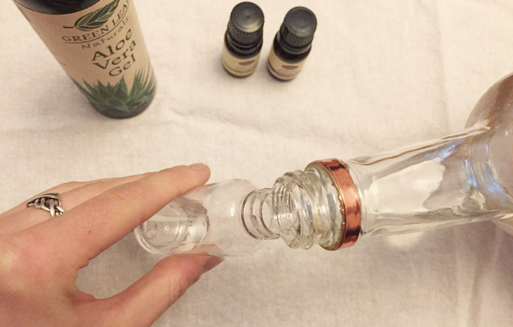 - Una pequeña botella de 1 ó 2 onzas. Tanto las botellas exprimibles de plástico sin toxinas como las botellas de plástico o de vidrio en aerosol funcionan bien. La mezcla de desinfectante de manos es lo suficientemente fina como para ser rociada, aunque saldrá en más de un chorro.