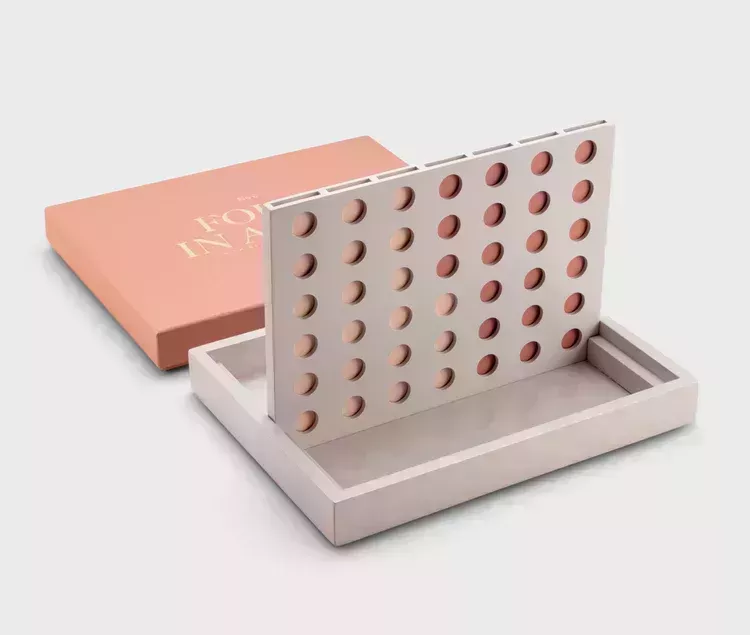 Noche de juegos, pero con un toque chic. Fabricado en madera lacada y con una suave paleta de colores rosas y grises, este juego de mesa se convierte en decoración para el hogar.
