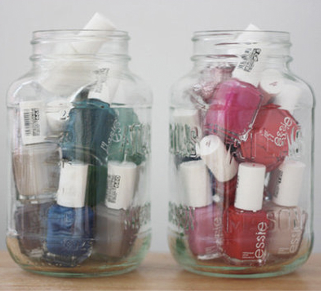 - Tarros para guardar los pintauñas. Busca algunos de gran tamaño y de cristal transparente, en los que podrás guardar todos los esmaltes y así podrás saber qué colores tienes y cual te apetece usar.