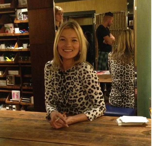 Los chicos de la tienda tomaron esta foto de Kate, sonriente y vestida de leopardo, y después la subieron al Twitter de la empresa (MarcJacobsIntl) con las siguientes palabras: "XOXO -Kate". Morimos. Seguro que es lo que la modelo escribe a cada una de las personas que compraron su libro.