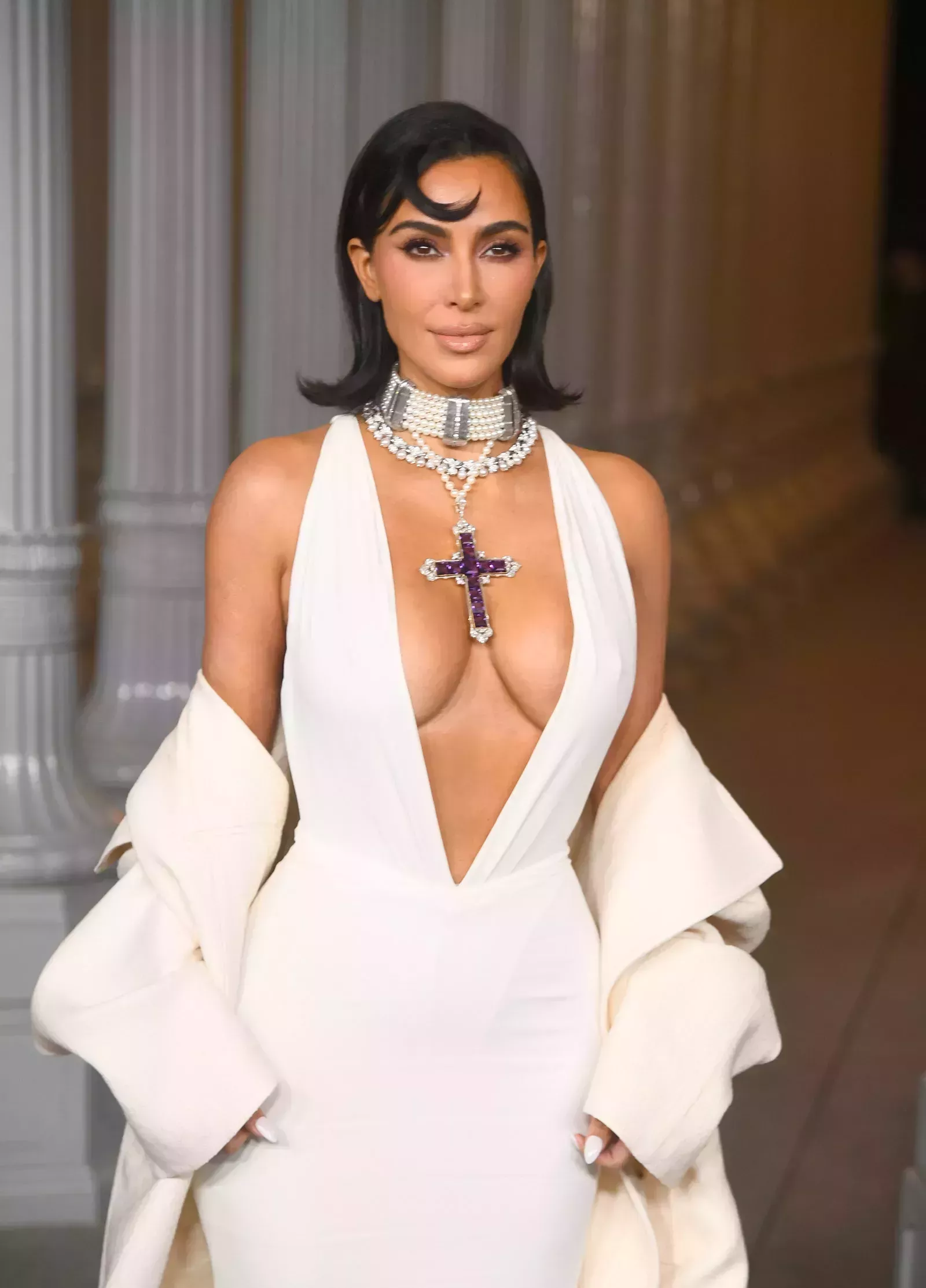 Kardashian compró en una subasta en 2023 el antiguo colgante de amatista en forma de cruz de Attallah de la difunta princesa y lo llevó a la gala repleta de estrellas, aunque se saltó el esponjoso peinado corto que Diana hizo famoso en favor de un moderno corte recto con un flequillo en forma de C abrazando un lado de su frente. El peluquero de Kardashian , Chris Appleton, empezó con una raya lateral profunda y alisó el pelo, después añadió extensiones de Bellami para dar volumen y lo cortó a la altura de los hombros. Appleton alisó las puntas del pelo de Kardashian con un rizador de 1 ¼" y terminó con un spray de brillo. Para el flequillo, lo rizó en forma de luna y se lo colocó en la frente.