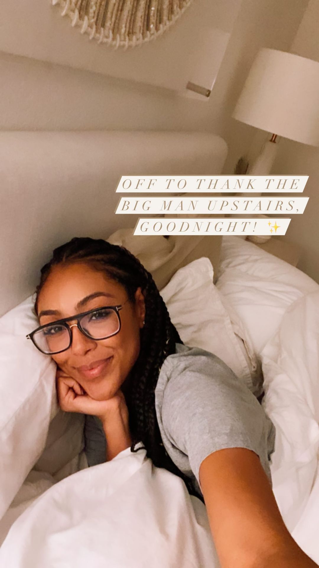 Avance rápido a un montón de tomas de Tayshia preparándose para la alfombra roja, antes de verla en la cama, con gafas y sin una pizca de maquillaje. "Me voy a dar las gracias al gran hombre de arriba. Buenas noches", escribió.