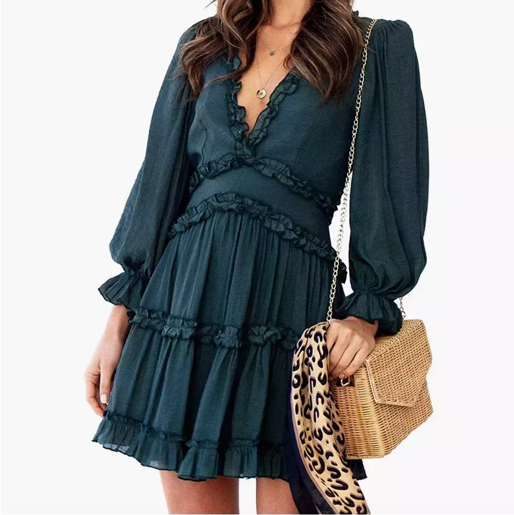 Ahora 23% de descuento Cuando lleguen las ocasiones más formales de la primavera, este vestido de manga larga con volantes incorpora un coqueto detalle de espalda abierta. La mayoría de los usuarios dijeron que les encantaba cómo les quedaba el vestido y que querrían comprarlo en todos los colores. Otra escribió: "Este vestido es 100% perfecto. Es ligero, las mangas son amplias...
