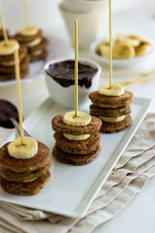 Estas brochetas de panqueques son una forma estupenda de controlar las porciones. Sus ingredientes estrella son la harina de avellana, los plátanos y el chocolate, una combinación de sabores insuperable.