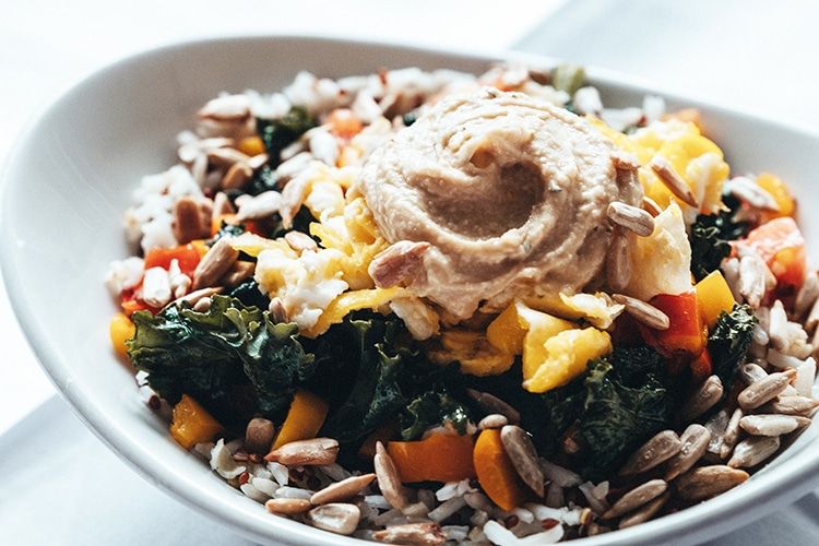 Este plato se llama técnicamente "bol de desayuno", pero, en realidad, puedes comerlo todo el día. Para hacer tu bol de hummus, necesitarás verduras, un grano saludable como la quinoa, semillas de girasol y tu tipo de hummus favorito.
