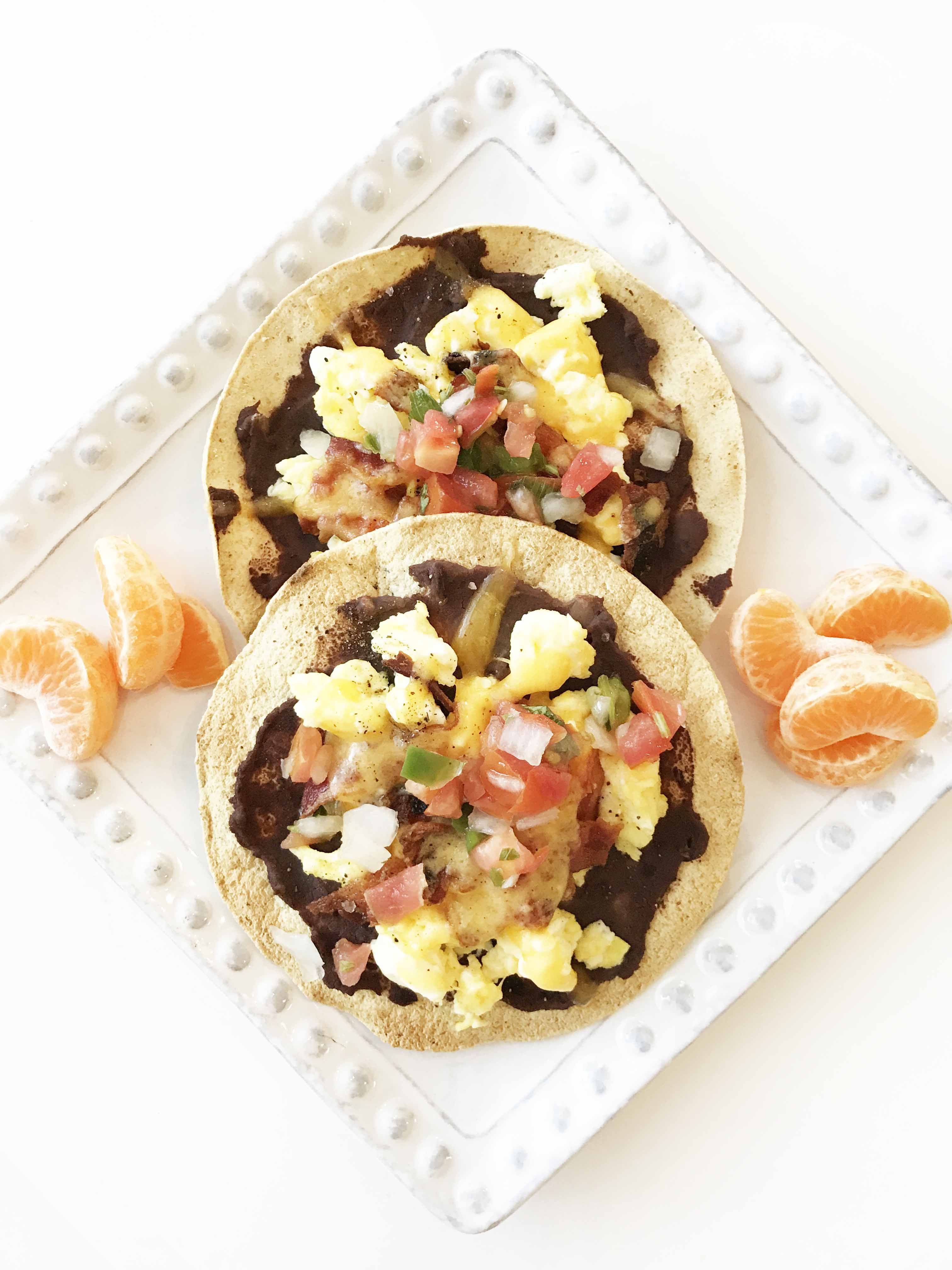 Sí, se puede desayunar comida mexicana. Calienta tu parrilla, revuelve unos huevos y machaca unos frijoles negros para armar esta deliciosa y satisfactoria tostada matutina. ¿Mencioné que está cubierta con queso y tocino?
