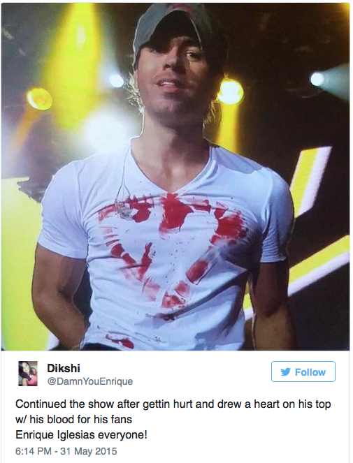 Ver a Enrique Iglesias sangrando en un concierto y continuando su actuación demuestra que es todo un profesional. Además, para rematar la faena, se pintó en el pecho un corazón con su sangre. ¡Toma ya!