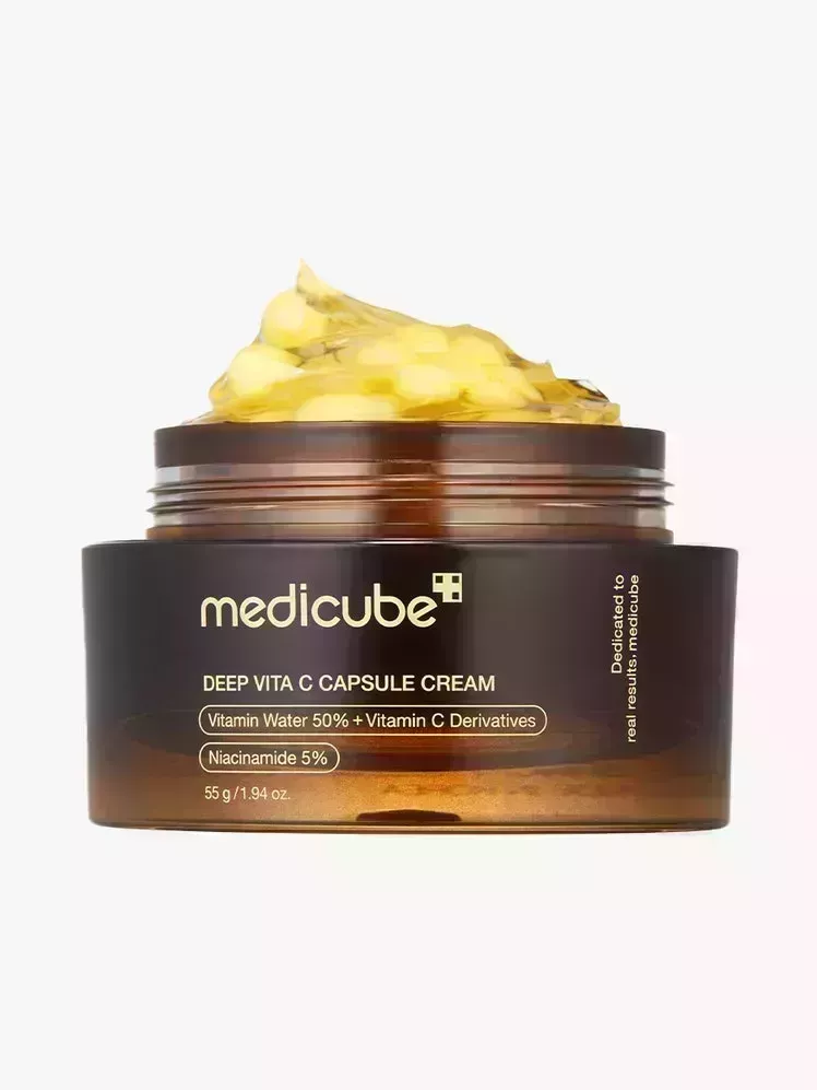 Si buscas una dosis de luminosidad, elige la crema hidratante facial Deep Vitamin C Golden Capsule de Medicube, que contiene vitamina C pura encapsulada, 50% de extracto de espino amarillo y 5% de niacinamida. El resultado es una textura mejorada y toda la luminosidad.