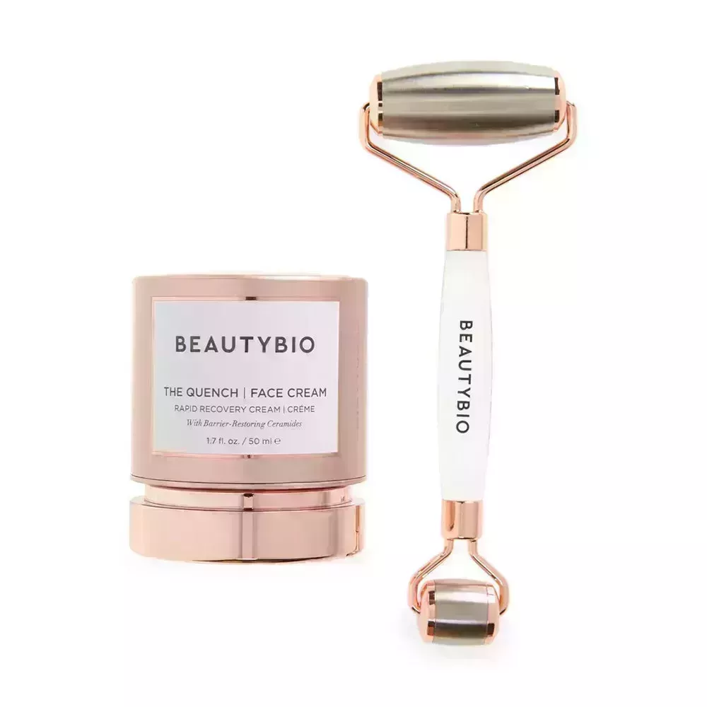 ¿Necesitas relajarte? El Set Facial Cryo de BeautyBio lo hará, incluso en un día de verano, y también esculpirá temporalmente tus pómulos. Aplícate una buena capa de The Quench Face Cream, con ceramidas hidratantes, antes de utilizar el Cryo Skin Icing Roller. Te encantará el impulso de la microcirculación, la constricción de los poros y el efecto desinflamante que te proporciona esta combinación.