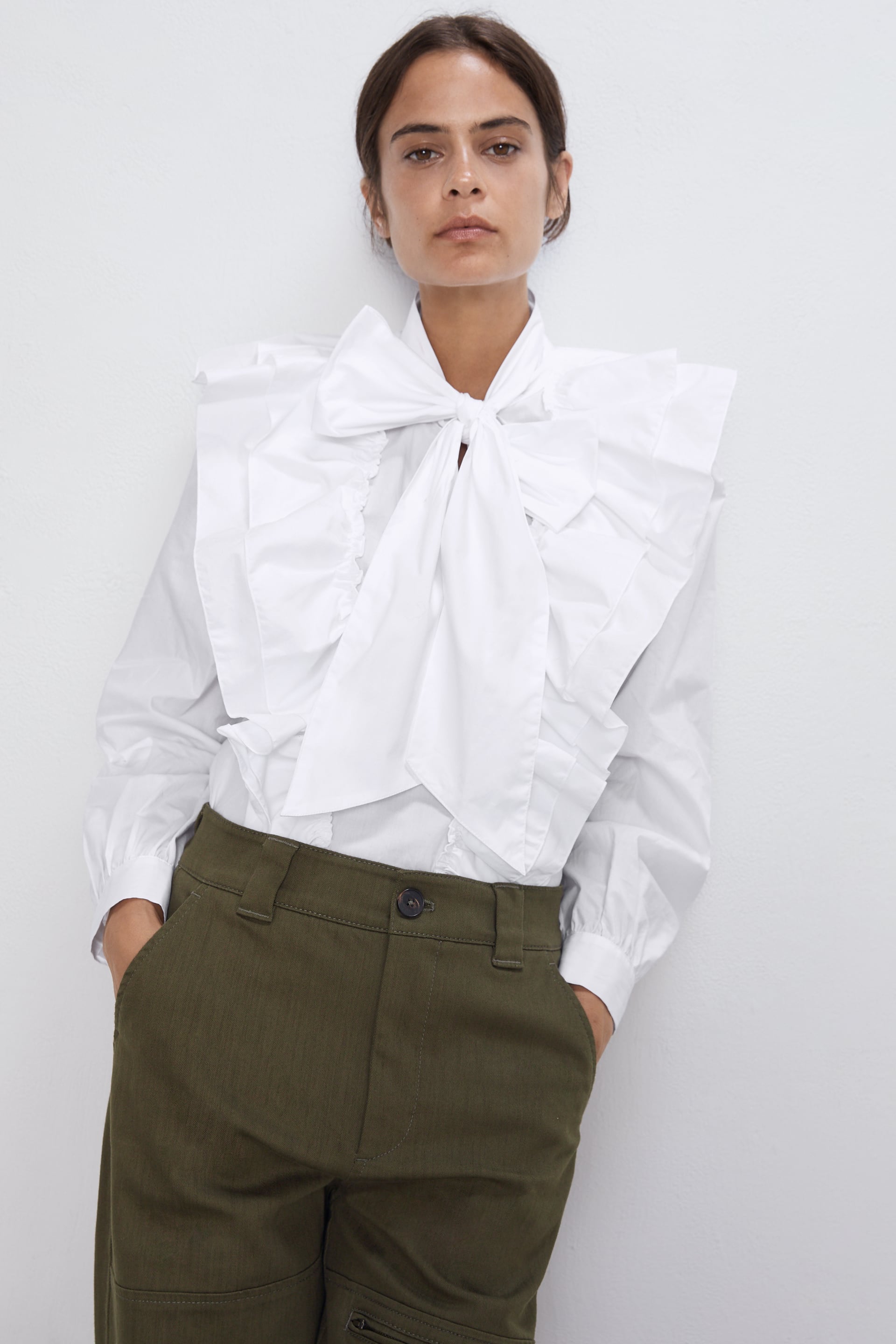 Este año nuestro cuello es el protagonista, por eso no se puede vestirlo con cualquier cosa, de ahí viene la tendencia de esta temporada por los lazos exagerados. Prueba con blusas amplia de cuello subido con lazada y manga larga, camisas oversize de manga larga y camisas negras con hilo metalizado.