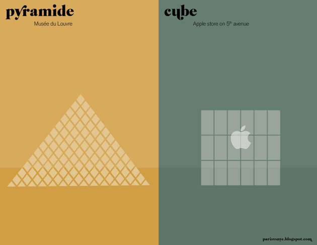 Este libro de ilustraciones se fundamenta en un único pero eficaz punto: la contraposición. A un lado la pirámide del Louvre, a otra, el cubo de la tienda Apple en plena 5ª Avenida, y así con muchas características parisinas y neoyorquinas, algunas muy evidentes, otras sorpredentes, pero sobre todo, todas muy divertidas.