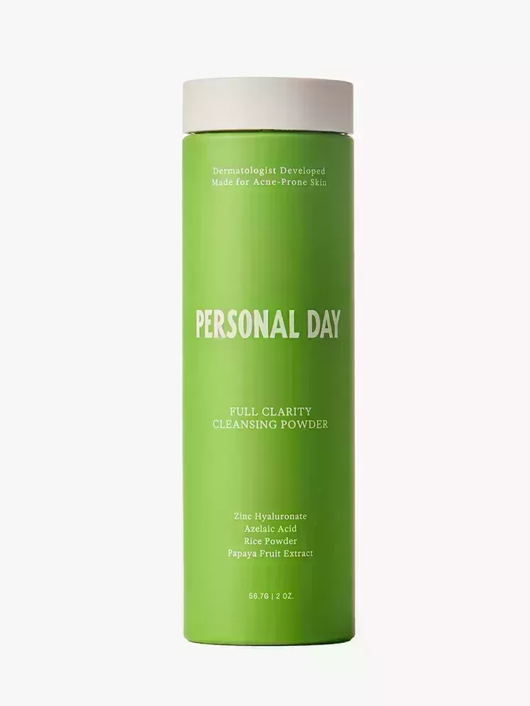 Espera seguir haciendo lo mismo por los demás con su nueva colección de cuidado de la piel, Personal Day. La línea se lanza hoy e incluye cinco productos: un polvo limpiador, un exfoliante rejuvenecedor, una mascarilla calmante, un tratamiento con ácido salicílico y una crema hidratante. La dermatóloga Mamina Turegano, la psicóloga Courtney Tracy y la esteticista Sarah Ford han colaborado en el desarrollo de los productos. "Creé Personal Day para personas con acné y piel propensa al acné o sensible", dice Reinhart. "Pueden usar estos productos y no desencadenar un nuevo brote".