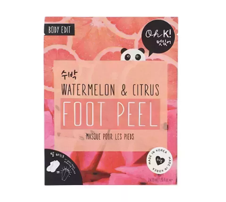 La cáscara de Oh K! está perfumada con sandía, pomelo y naranja sanguina para que te sientas como en unas vacaciones tropicales estés donde estés. Tus pies quedarán perfumados y suaves en un abrir y cerrar de ojos.