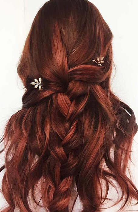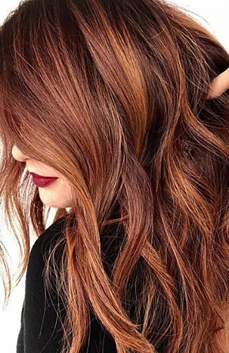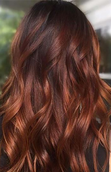 A menudo se dice que el pelo rojo favorece más a las rubias naturales, pero las morenas también pueden hacer la transición con resultados sorprendentes. Una gran opción para las mujeres de pelo castaño es el pelo rojo-marrón oscuro. El tono mezcla tonos de vino tinto con una base de chocolate para crear un hermoso resultado final. Rico y aterciopelado, aún se destaca y luce particularmente halagador en aquellas con tez clara.