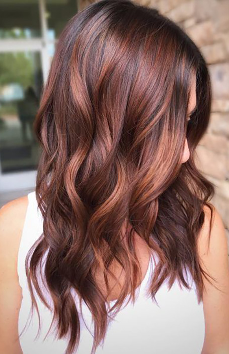 El tono castaño combina el marrón con tonos rojos cálidos, lo que lo convierte en la elección ideal para las morenas claras que buscan moverse más oscuramente en el espectro del rojo. Un color de fácil transición, los reflejos castaños son perfectos para los meses más fríos del año, ya que añaden una sensación otoñal a su aspecto. Añade luces bajas más profundas de color caoba o canela para llevarlo al siguiente nivel.