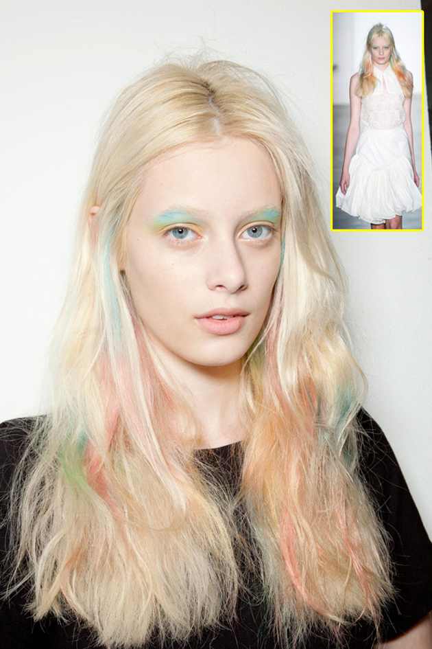 Las modelos llevan algunos mechones de su pelo teñidos de un color fantasía, como azul o rosa, que queda especialmente bien cuando la chica es rubia, o como vemos en la imagen, platino. El rostro se maquilla con los idénticos colores que se ven en el pelo, y las sombras se pintan en el hueso de la ceja, más que en el párpado móvil.