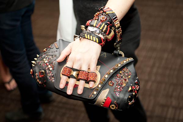 El bolso de mano tiene gracia, las asas hacen las veces de anillos y recuerdan inevitablemente a los clutch de Alexander McQueen. Mezcla el estilo motero con lo étnico de las cuentas de color y el resultado no puede ser más divertido.