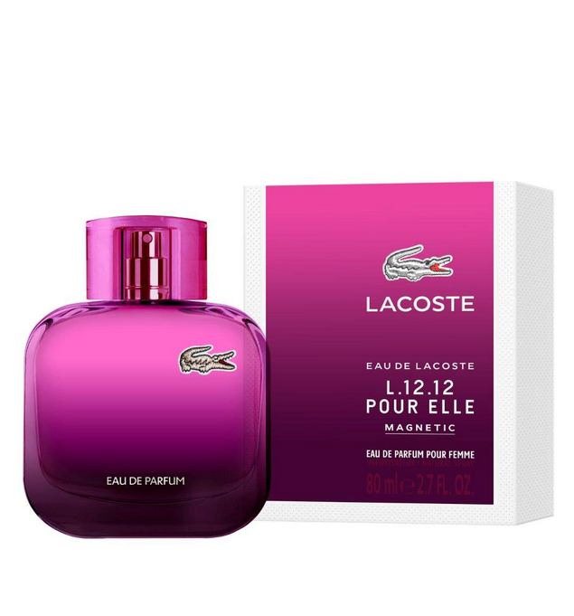 Magnetic Femme de Lacoste, es una “eau de perfume” que pertenece a la familia aromática floral frutal para mujeres, que fue lanzada en 2016. El frasco es de cristal de color fucsia degradado, de más claro a más oscuro. En la parte alta de la pirámide encontramos naranja, clementina y mango; como notas medias cuentan con heliotropo, jazmín, rosa y hojas de violeta y en la base permanecen pachulí, haba tonka y vainilla.