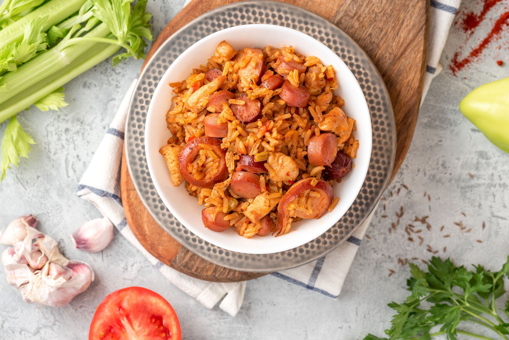 "Una pequeña porción de jambalaya puede ser una buena opción debido a la densidad de nutrientes del apio, pimientos, cebollas y camarones", dice McDaniel.
