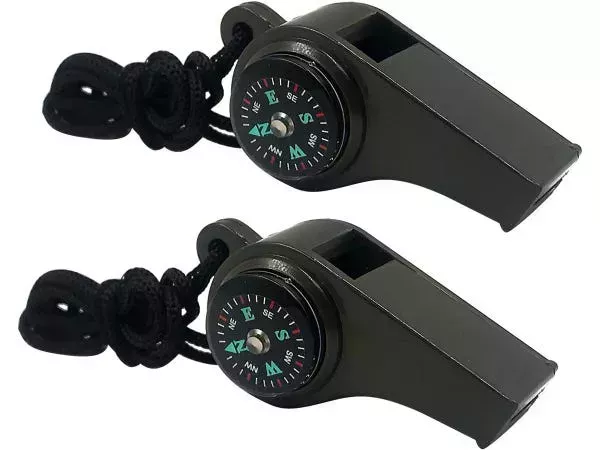 Este silbato, que se vende en paquetes de dos unidades, también incluye una brújula y un termómetro. El cordón incluido hace que sea fácil de llevar alrededor del cuello o de sujetar al exterior de una mochila.