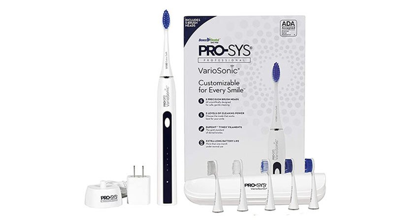 Sube el juego de dientes y limpia más inteligentemente, no con más fuerza. El cepillo de dientes eléctrico Pro-SYS VarioSonic viene con cinco cabezas de cepillo de precisión diferentes para que puedas hacer la elección perfecta para tu cuidado bucal. También hay cinco modos de cepillado diferentes. Cuando se combina con los cabezales, eso significa que puedes elegir entre 25 intensidades diferentes para la limpieza definitiva. La unidad dura un mes con una sola carga, con un indicador luminoso que avisa cuando la batería se está agotando. También tiene un temporizador incorporado de dos minutos, para que sepas que has hecho sentir orgulloso a tu dentista.